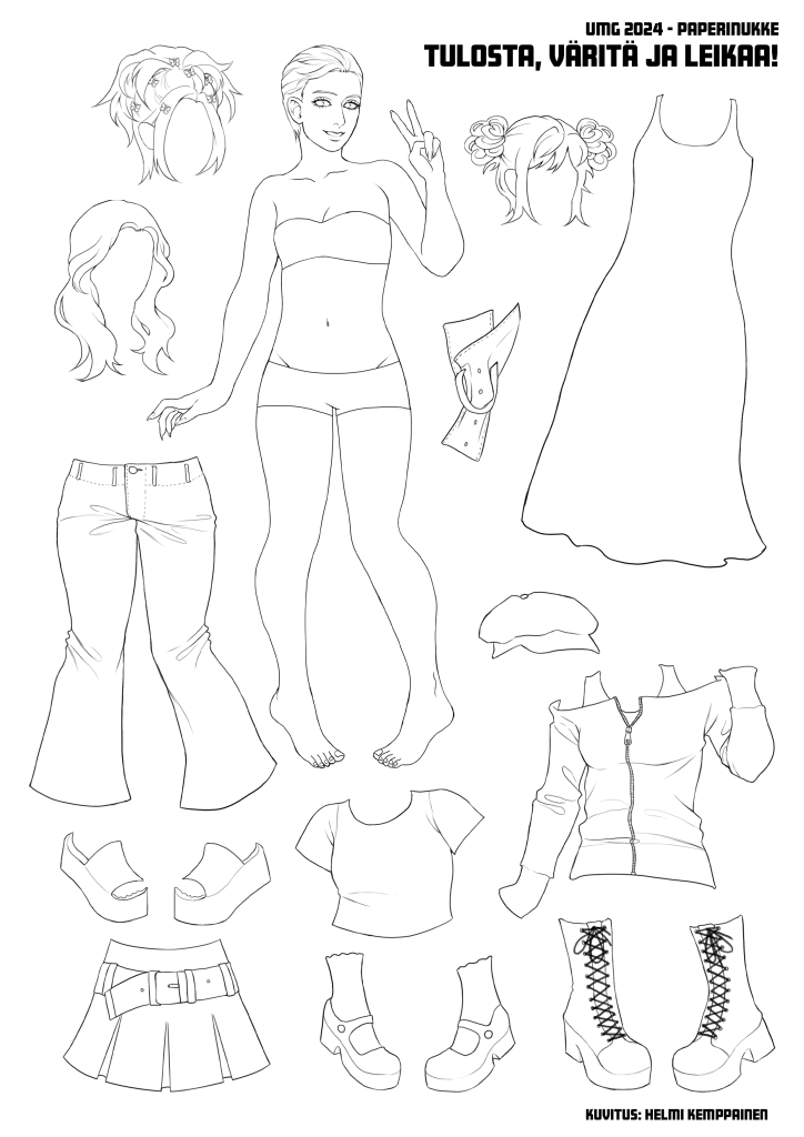 Helmi Kemppaisen UMG-lehdelle toteuttama paperinukke löytyy fyysiessä muodossaan painetusta lehdestä, mutta tulostettavan ja väritettävän version voit ladata itsellesi tältä sivulta.
